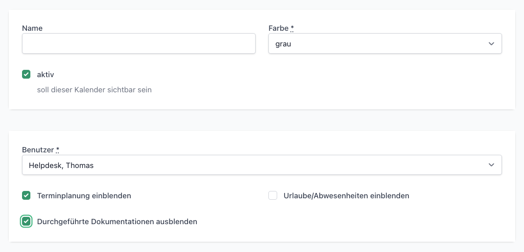 Hinterlegen Sie sich selbst als Benutzer*in und aktivieren Sie die im Bild markierten Optionen. So sehen Sie alle für Sie relevanten Termine, ohne dass bereits dokumentierte Einträge doppelt erscheinen.